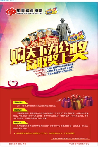 本次促销活动从2016年12月17日开始,凡购买中山市内发行销售的“天下为公”刮刮乐即开票,中得10000元奖级的彩民,除获得相应奖金外,同时获得10000元现金加奖;中得1000元奖级的彩民,除获得相应奖金外,同时获得1000元现金加奖;中得500元奖级的彩民,除获得相应奖金外,同时获得500元现金加奖,共安排20万元促销奖金,奖金派送完毕时,中山市福彩中心将及时向社会作出活动结束公告。