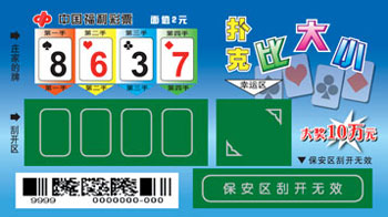 票面上庄家的牌中印有四手牌,按顺序刮开刮开区中第一手牌,与庄家相对应的第一手牌相比较,大于庄家为胜一手,再依次刮开第二手、第三手、第四手牌,分别与庄家相对应的同一手牌相比较,符合奖级构成表内的中奖图符即中相对应的奖金;再刮开幸运区,出现的中奖金额即中相对应的奖金,兼中兼得。