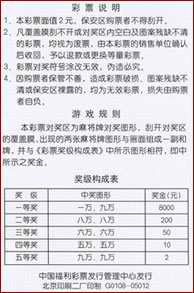 本彩票选用麻将牌作为对奖图形,刮开对奖区的覆盖膜,出现的两张麻将牌图形与画面相结合组成一副和牌,并与《彩票奖级构成表》中所示图形相符,即中所示之奖金 。