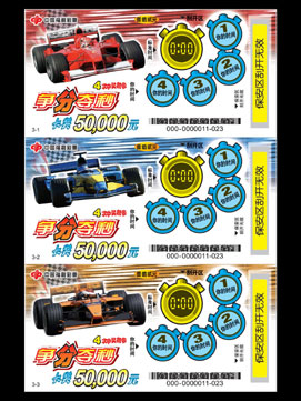 高速、动感的赛车票面,再现了赛车场“争分夺秒”,紧张、激烈的场面。 以赛车计时用的秒表作为玩法区,更给人一种紧张刺激的感觉,奖符用秒表上的数字体现赛车时争分夺秒的紧张气氛。一张票,有四次中五万元大奖的机会