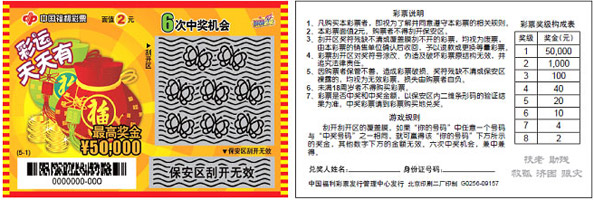 刮开刮开区的覆盖膜,如果“你的号码”中任意一个号码与“中奖号码”之一相同,就可赢得该“你的号码”下方所示的奖金,其他数字下方的金额无效。六次中奖机会,兼中兼得。