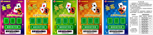 彩票游戏规则:刮开刮开区的覆盖膜,出现的三张扑克牌图形组合(不限前后顺序)与《彩票奖级构成表》中所示图形组合相符,即中所示之奖金。