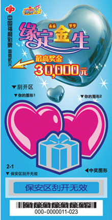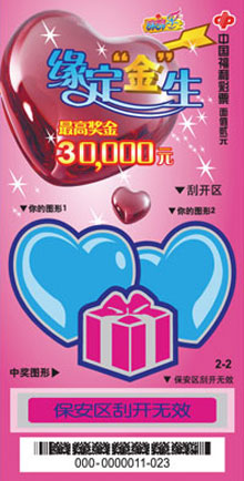 缘定金生彩票起名源于“缘定今生”这个词。彩票起这个名字有了双重含义,寄予了对爱情的美好祝愿同时还让彩民有喜上加喜的感觉。彩票共分蓝色和粉色,两张彩票拼凑在一起奏出爱情的和美乐章。 缘定金生彩票是以对图形为主。在设奖方面,彩票的中奖面有30%多,能让彩民在购买过程中体验到更多的中奖乐趣。