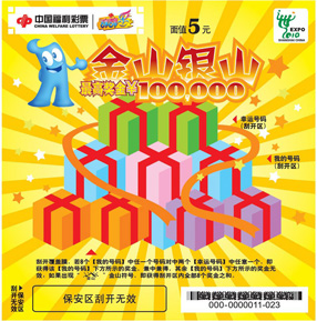 为配合2010年上海世博会而发行的专题系列彩票。此次世博系列彩票又更新了新的三个系列,分别为“星耀世博、金山银山、欢乐彩”。听到彩票的名字就不由自主让人联想到成堆的金银财宝堆积如山,带着满满财富的金山银山,以鲜亮的票面,高额的头奖吸引你的购买。