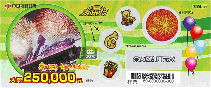 本彩票画面设有一条跑道,外侧设有两个刮开区,每个刮开区内有四组数字,刮开刮开区(一)的覆盖膜,按数字顺序从跑道起点开始前进,每个数字代表前进步数,跑到上每个图形方格为一步,前进中在所到图标位置做上标记,再走第二个数字,按所标数字接上次位置继续前进,在所到位置再做上标记,以此类推。走完第四组数字后,所做标记的图标如出现三个相同的图形,并与《彩票奖级构成表》中所示图形相符,即中所示之奖金。刮开区(二)与刮开区(一)玩法相同,重新从起点开始。