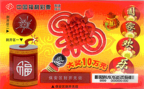 本彩票每张票上有两个玩法区,彩票游戏规则为:玩法一:刮开刮开区一,若出现三个相同的图符,并与彩票奖级构成表中图符相同,即中相对应的中奖金额。玩法二:刮开刮开区二,刮出的数字符号即为中奖金额。