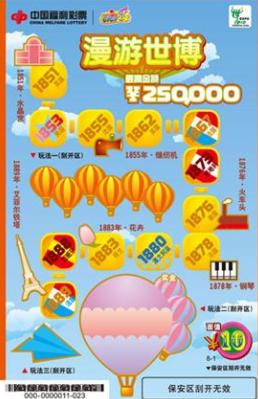 “漫游世博”彩票单张面值10元,返奖率65%,最高中奖金额25万元。它是为数不多的10元面值彩票同时具有三个游戏玩法的票种,请感兴趣的彩民朋友切莫错过了。
