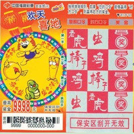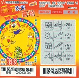 “欢天喜地”游戏规则:“虎吃鸡、鸡吃虫、虫吃棒、棒打虎”。分别刮开1—4手刮开区,如果“你的口令”能够赢得“对方口令”,则赢得右方的奖金,兼中兼得。如果出现与本游戏规则不同的口令组合,则右方的奖金值无效。