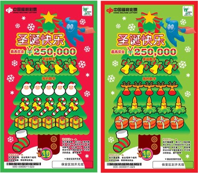 业主刘先生将2元和10元的“刮刮乐”都拿了一些出来,父亲见还剩4张面值10元的“圣诞快乐”,连忙叫业主给了两张,并连声说着:“这个好啊!这个中奖机会多,票面相当精美,我中过几次小奖,就要这个了!”