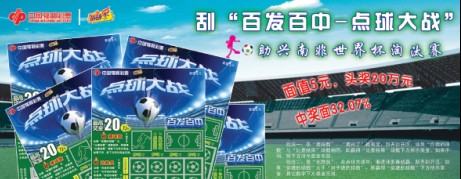 6月26日,2010年南非世界杯足球赛1/8决赛开踢。为助兴本届世界杯淘汰赛阶段的比赛,福彩刮刮乐推出了新票种“百发百中-点球大战”,彩友在观看比赛时,也可以进行“点球大战”,赢取幸运和快乐。目前该票种已经全面登陆济南彩市,彩友可到各福彩刮刮乐销售点购买。据悉,本款彩票面值5元,最高奖金达20万元,共设10个奖级,中奖面32.07%。