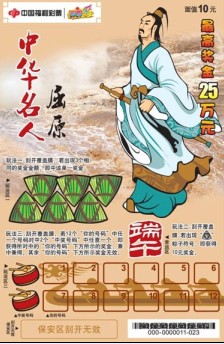 “中华名人2-屈原”,票面以屈原画像为主题,结合了吃粽子、赛龙舟等端午节的传统文化元素,具有很强的文化性。面值10元,头奖25万元,中奖面35.71%,12次中奖机会,有三种玩法,玩法一的刮开区是六个粽子,对应的是“六数三同”游戏。玩法二是采用“刮粽子”的游戏,见到粽子就中奖。玩法三的刮开区是众人擂鼓划龙舟的场景,具有浓厚的节日气息,采用的是对数字的游戏。三种玩法各有特色,具有很强的趣味性。(文采玉英)