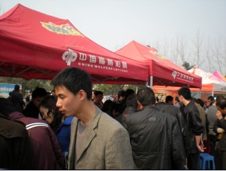 由市民政局分管局长蒋元瑛同志的带领下,市福彩管理站全体员工、10多名销售站业主。在位于招聘会主会场西侧,搭起了销售棚,借“招聘会”春风,进行了新年第一场大型户外销售。