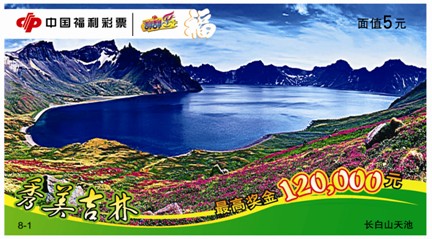 “秀美吉林”以“吉林八景”为主题,票面设计精美,八张为一套,长白山天池、高句丽古迹、向海、防川景区、伪满皇宫、松花湖雾凇、净月潭、查干湖冬捕等景色跃然票上,充分展示了吉林省最具特色的人文景观。除简单好玩,即开即兑的特点外,一张彩票还有十次中奖机会,面值为5元,中奖面30.76%,返奖率65%,最高奖金12万元,奖级设置丰富合理。