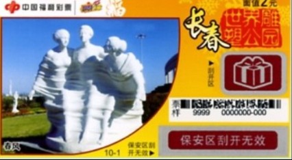“长春世界雕塑公园”即开型彩票,是长春市首次发行以本市建筑为主题的彩票,票面为长春市雕塑公园内的各款雕塑,用彩票这种特殊的公益载体来展现长春市的文化和建设成就。该彩票为小奖组玩法,10张为一套,面值2元,中奖面28.32%,返奖率65%,一等奖奖金1,000元,玩法简单,中奖容易。希望能为越来越多的彩民朋友送去奖金和欢乐。(杨永春)