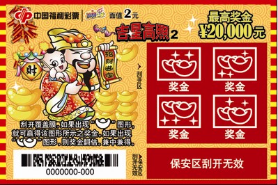 “吉星高照2”票面设计精美、华丽,在红黄相间的背景中布满了象征吉祥的祥云纹,寓意高升和如意,抱着散财童子的财神站在象征着财富的一堆金元宝中,乐呵呵地向您举起“招财进宝”的卷轴,预示着惊喜一刻的来临,而散财童子手中的“财”字灯笼和蝙蝠也让整个票面有了“财到福来”的喜庆意味。“吉星高照2”面值2元,中奖面30.15%,返奖率为65%,一等奖2万元,小奖实惠不已。该彩票玩法简单,刮开覆盖膜,如果出现“元宝”图形,就可赢得该图形所示之奖金。如果出现“双元宝”图形,则奖金翻倍,并且兼中兼得,共四次中奖机会。(杨永春)