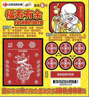 “福寿有余”面值5元,大奖10万元,有两种游戏玩法,兼中兼得。游戏1: 刮开覆盖膜,如果“你的图形”与“中奖图形”中任一图形相同,即可赢得该图形下方所示之奖金,其他图形下方的金额无效;兼中兼得。游戏2: 刮开覆盖膜,有两局游戏,在任一局游戏中,如果出现三个相同的奖金即中该单一金额;兼中兼得。 (丁伟)