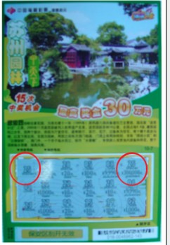 “苏州园林”为今年刚上市的刮刮乐新票种,面值10元,最高奖金30万元,共有15次中奖机会,兼中兼得。该票一套10张,制作精美,具有很高的收藏价值。具体游戏规则为:刮开覆盖膜,如果任意一个“你的号码”与任意一个“中奖号码”相同,即获得该“你的号码”下方显示的奖金。