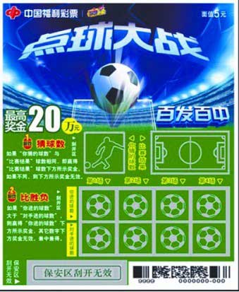 为助兴本届世界杯淘汰赛阶段的比赛,“刮刮乐”大家族推出了福利彩票新票种“百发百中-点球大战”,让同为球迷的彩迷们一举两得。