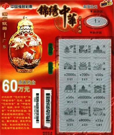 “锦绣中华”是特意为新中国成立60周年献礼的彩票新品种,一等奖设定为60万元,和60周年契合,也是中国福彩即开型彩票推出的中奖金额最高的一款彩票游戏。