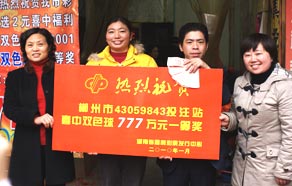 1月4日下午,湖南省福彩中心市场部部长冯梅和郴州福彩中心谷莲英主任以及朱焰烽副主任来到第43059843号投注站,为业主颁授奖牌并给予了1万元现金奖励。颁奖时,冯部长特别祝愿全省彩民多中奖、中大奖,延续新年的好彩头。业主陈女士表示不知道是谁这么幸运为湖南彩民打响了这新年第一炮,今早才知道自己投注站中出了一等奖。这家投注站由他们夫妻俩共同经营六年了,他们自己也是彩民,买福利彩票十多年了,因为爱彩,所以卖彩,喜欢推荐号码,尤其对蓝球有一手,命中率高达90%。第43059843号投注站人气旺盛,大多数彩民是上班族的中年人。该站的中奖情况也很喜人,中过22选5、3D、刮刮乐的大奖。