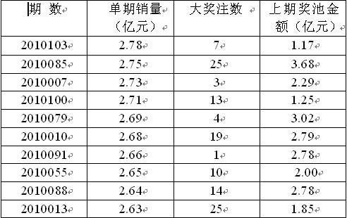 中彩网统计显示,今年以来,双色球单期销量2.6亿元以上共有14次,产生大奖121注,占头奖总数的16.46%。同时,记者在统计中还发现,双色球每期单期销量与上期奖池金额的多寡都有很大的关系。2010年双色球单期销量排行榜前十名,每期的上期奖池金额几乎都在亿元以上,最低金额为1.17亿元,最高金额为3.68亿元。(袁 航)
