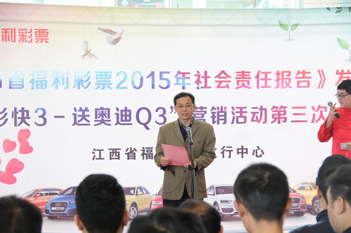 11月10日,江西福彩在南昌举行2015年社会责任报告发布会,公开报告2015年度江西福彩在践行宗旨、履行承诺、遵守法则等多方面情况,让关心、支持和参与福利彩票事业的热心人士,进一步了解福利彩票,进一步看到一个透明的、公信的、责任的江西福彩。