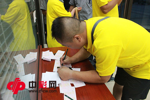 “销售员,你好,麻烦机选五注双色球。”福彩中心一楼福彩销售终端机旁排着一列购彩的安徽团代表们,销售员按照各位代表的需求熟练的出票。第一次走进双色球现场的业主沈宗涛,今晚买了两注复式,外加五张机选的单注彩票。平时在站内,双色球是期期都要买,但是每期投入都在十元左右,这一次他却买了不少注。“来一次福彩中心,看一场双色球开奖直播,这机会我等了九年多了,这样的经历太难能可贵,带来的好运也会是翻了番,得抓住好运,怀揣希望,今晚中奖的可能就是我哦。”性格爽朗的沈宗涛掩饰不住激动,向记者展现着手中的彩票。