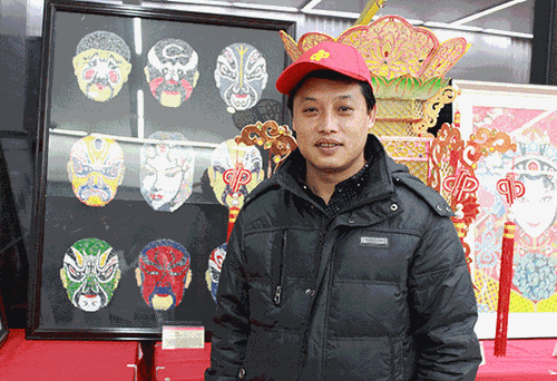 陕西代表李先生在陕西刮刮乐手工艺展品前合影